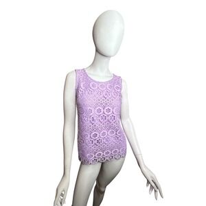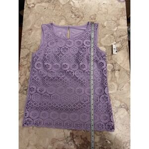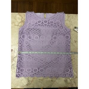 New with tag sleeveless LACE TRIM KNIT SHELL by Talbots. Pretty purple 95% rayon, 5% spandex fabric. Beautiful lace layer (lace is made from 100% polyester) in the front and key hole closure in the back. This would be fun in the spring with a blazer or jean jacket. In excellent new with tags condition - no holes or stains. This super cute tank shirt is a size P - please see photos and flat lay measurements for best fit: