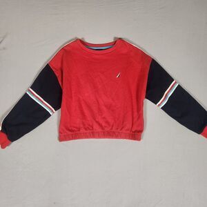 Nautica Sweatshirt Women M Red Colorblock Crop Pullover Logo Striped Sleeve