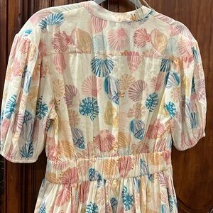 Charming nautical dress with button-up front. Features puff sleeves and a colorful pastel shell pattern. Love this dainty & sweet cottagecore style!!! Elastic waistband in the back.