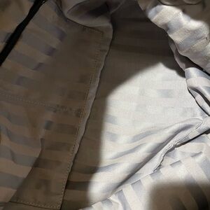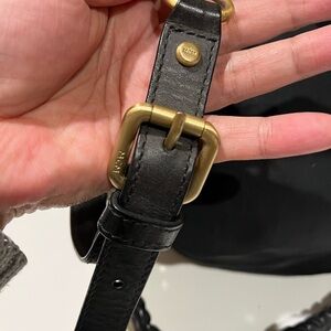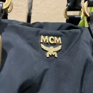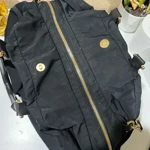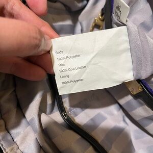 Authentic pre-loved. Made with 100% polyester with cow leather trim. Long strap made of leather and gold chain. Snap-on and zipper closure. Some stains on the inside.