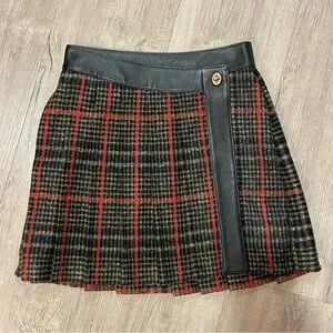 Coach Wrap Wool and Leather Tartan Mini Skirt - Black, Tan and Red
