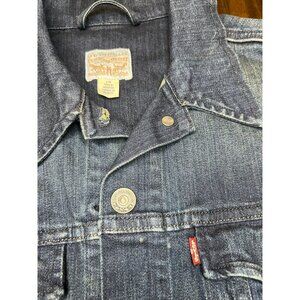 Levi Strauss Denim Trucker Jacket Women's Large Dark Blue Distressed Casual