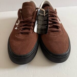 Classic low-top Converse sneakers. Rich brown suede with black accents. Iconic star logo on the side.