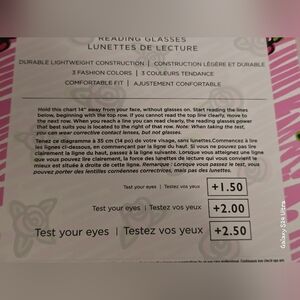 3 pairs of reading glasses new in box, see reading chart on back to determine strength needed. These are +1.50 strength Magnification