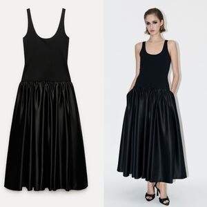 Round neck dress with wide straps. Voluminous skirt in tonal matching fabric