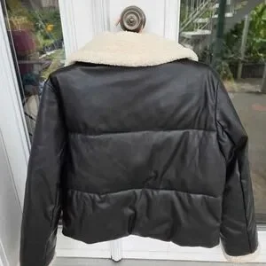 Chic black puffer with cozy cream collar. Ideal for cold weather. Features zip pockets and front closure.