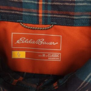 Style: Men's long sleeve button-front plaid shirt in a classic fit with two chest button-flap pockets and an Eddie Bauer logo tag.