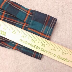 Color: Green and navy blue plaid with orange accent stripes.