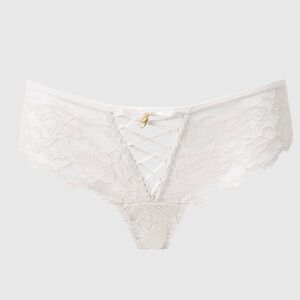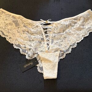 Frederick’s of Hollywood lace up front tanga. Experience comfort and style with these elegant white lace panties with lace up front detail. Perfect for any occasion, they offer a delicate and feminine touch to your intimates collection. Sz XXXL. NWT