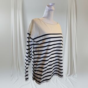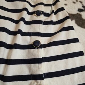 Elegant navy and white stripes. Soft fabric. Perfect for layering or standalone wear. Pre-owned.