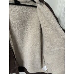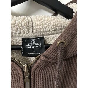 This Vintage Foot Locker Fleece Lined Hooded Zip Up Sweatshirt is a nostalgic piece from the early Y2K era, featuring a solid brown color and a comfortable fleece fabric type. With a Full Zip closure and a hood for added warmth, this size L sweatshirt is machine washable and perfect for the winter, fall, or spring seasons. The classic design with a regular fit and lined accents make it a stylish and cozy addition to any man's wardrobe.