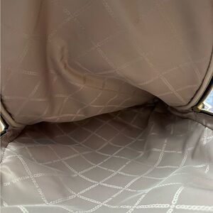 Elegant Michael Kors backpack with iconic logo pattern. Features black accents and gold hardware. Ideal for daily use. The blue leather band on back is missing