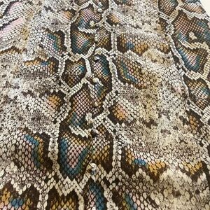 Stylish snakeskin print dress or tunic with short sleeves. Features a mix of brown, black, and cream colors.