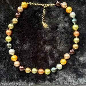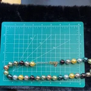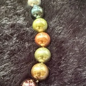 Stunning necklace with vibrant beads in metallic green, silver, gold, & bronze. Adds elegance to any look.