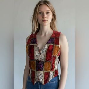 This Vintage 90s Y2K Velvet Patchwork Vest in Medium size features a unique jewel tone color palette, perfect for a fairy grunge festival vibe. The embroidered accents and patchwork design add a touch of artistry, while the lightweight and collarless design make it a versatile piece for various occasions such as travel, parties, casual outings, formal events, or business meetings. Made from velvet fabric with a polyester lining, this American Vintage vest is a one-of-a-kind addition to any wardrobe, with a retro 90s theme ideal for those who appreciate vintage fashion.