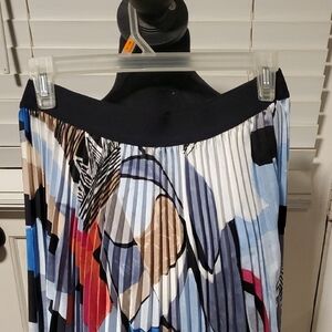 Stylish skirt with abstract multicolor design. Features pleated detail for a modern look. Size small. 11oz.
