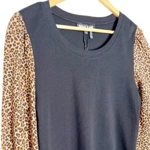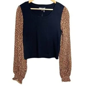 New with tag DKNY Jeans crop top blending a black ribbed knit bodice with dramatic leopard print puff sleeves. The long sleeves feature a gathered effect leading into a smocked cuff, adding a touch of flair to this stylish piece. The neckline is a classic crew cut, and the hemline hits at the natural waist. Size M. Style: E23FDHLU. Body: 96% Cotton, 4% Spandex. Sleeves: 100% Rayon. Made in India. Machine wash cold.