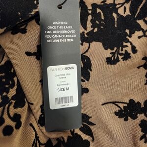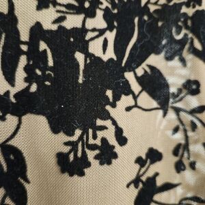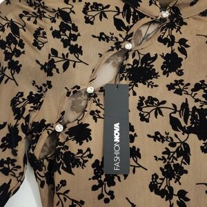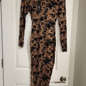A sexy asymmetrical shoulder buttons coffee color dress with black velvet floral design. Tag says size M but though it is a stretchy material it is rather size S, like 4-6.