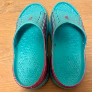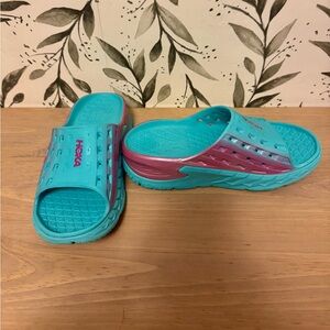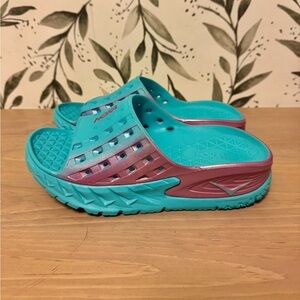 Hoka One One Ora Recovery Slides. Women’s size 8. In great condition. Lightly worn with no damage. Incredibly comfortable. If you’ve never had a pair, they run slightly small (in my opinion). Measurements included in photos. I’m a 7.5 and these fit perfectly.