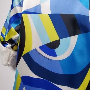 Elevate your loungewear with this vintage Victoria's Secret satin robe, a playful and cozy addition to any sleepwear collection. Featuring a vibrant multicolor geometric pattern, this kimono-style robe offers both comfort and style.