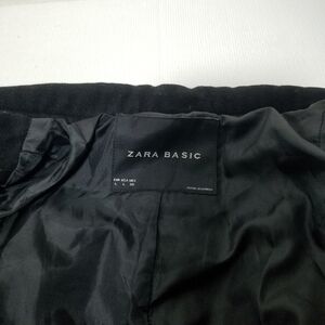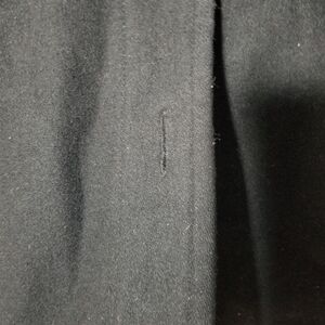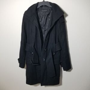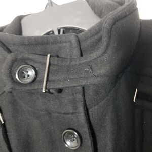 Stay stylish and warm with this elegant black belted coat. Perfect for any occasion. Bottom button missing and 1 neck closure button missing < see pics >