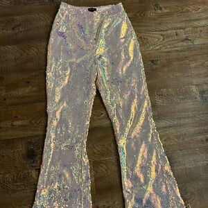 Add some sparkle. Feel fierce in our flare pants, made in high quality sequin fabric with a iridescent colorway, and a fun feather trim.