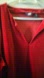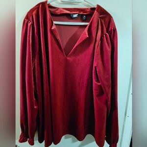 Luxurious deep red velvet top with a V-neck. Features long, elegant sleeves. Pit to pit 26 inches, 29 inches from shoulder to hem. Long blousy sleeves with elastic at the wrist.