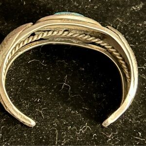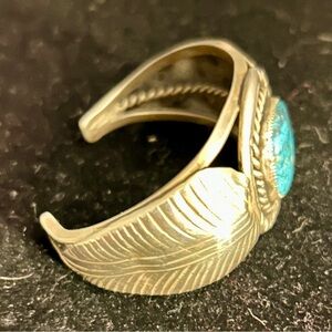 This item is a vintage Signed Navajo cuff bracelet crafted from sterling silver and featuring a central turquoise stone surrounded by hand-twisted rope work and embellished with sterling silver leaf designs.