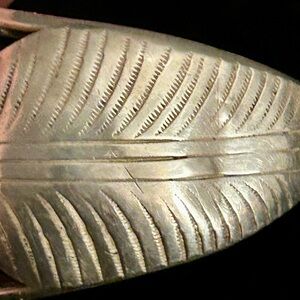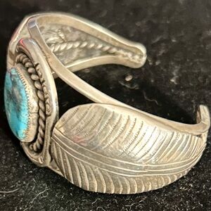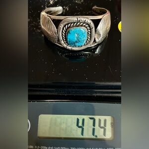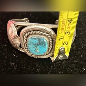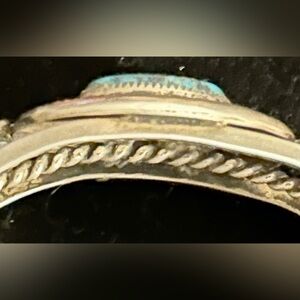 It is signed, but it’s hard to make out the hallmark. If you know much about Native American art, you might be able to figure out who the artist is. In my research I’m guessing it’s from the 1960’s. And Bear might be in the artists name. The turquoise is American Navajo Carico lake.
