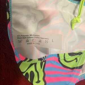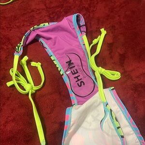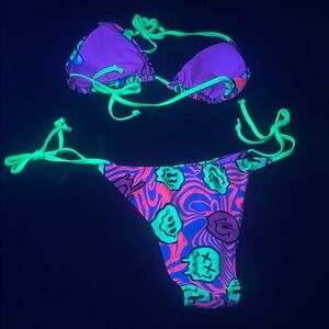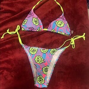 Vibrant bikini with abstract patterns. Triangle top and tie-side bottoms. Perfect for a bold beach look.
