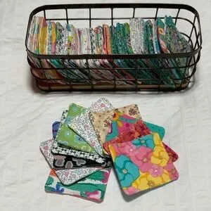Random selection of assorted cotton prints on front and 2 layers of flannel on back, including thread (fully compostable) Planet friendly 3 x 3 inch