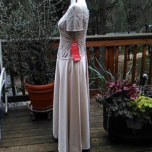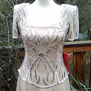 NWT. Beautiful formal with fabulous details. Simple and elegant. Top has deep scoop, short sleeves, shoulder pads. Lots of beads placed in a pretty symmetrical design, all perfectly intact. Curved front and back with little vents. Back zip. A-shape skirt that floats down you curves. Size 4P fits on my size 6 mannequin perfectly , measures 34 at chest, 28 at waist ,50 at hips fuller skirt. 54 long from shoulder to hem. Perfect for a wedding or any formal event where you want to look beautiful.