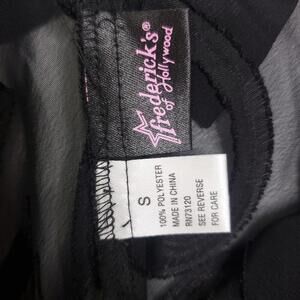 This product is a sexy and feminine Fredricks of Hollywood dress for women in size small. The dress is a sheer lingerie slip in a floral pattern, featuring a V-neckline and sleeveless design. The black dress is made of polyester and has a short length, making it perfect for a party or cocktail occasion during the summer or spring seasons. It is a pullover style with hand wash care instructions, catering to those looking for a stylish and daring wardrobe choice.