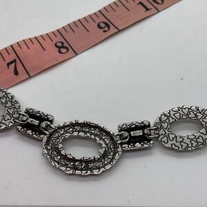 This bib necklace features intricate silver plated links paired with rich reddish brown accents. This is a bold piece. Great used condition as shown.
