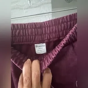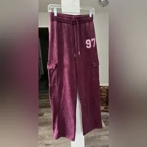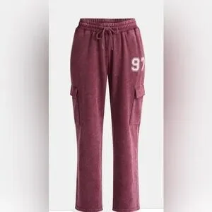 Comfortable dark cherry sweatpants with a sporty “97” graphic design. Features cargo pockets and drawstring waist. Pre-loved and in good condition.