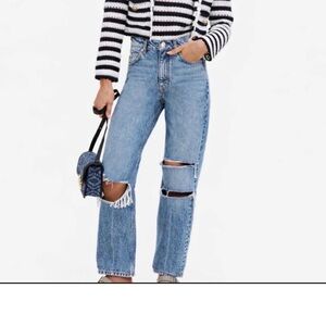 Chic light blue jeans with stylish rips. Relaxed boyfriend fit. Perfect for casual outings.