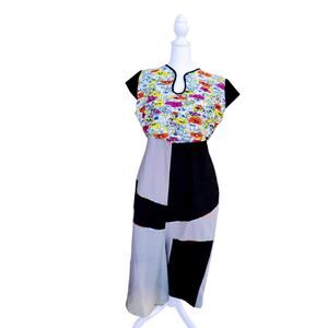 Unique Details: Includes short black contrast sleeves and an asymmetrical patchwork pattern on the skirt for a truly artisanal look.