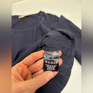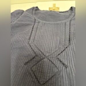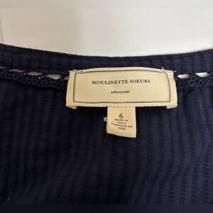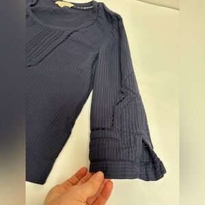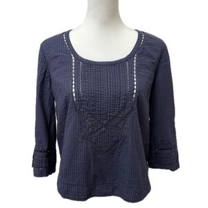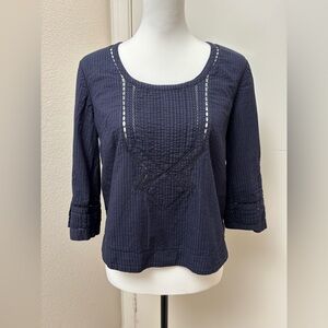 Anthropologie Moulinette Soeurs navy blue size 6. Scoop neck. Seersucker stripe texture. Pretty eyelet diamond designs throughout. 100% cotton. 3/4 sleeves. Slits at slightly flared sleeves. Lightly curved hemline.