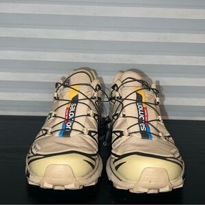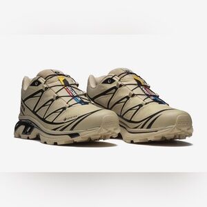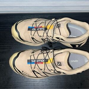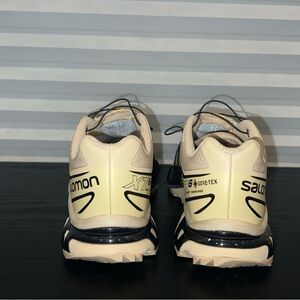 Sleek Salomon sneakers with a beige and black design. Perfect for outdoor adventures. Only worn a handful of times as size was not correct. In the color safari. Has some minimal scuffs to the interior side black plastic components. A legendary trail running icon reinvented for the city, the XT-6 GORE-TEX continues its legacy of comfort, cushioning and stability. Innovative waterproof protection, new colors and upgraded materials make this sneaker a triple threat, every day, whatever the weather.