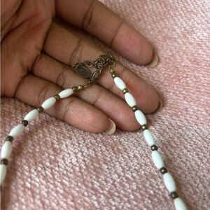 Teardrop pendant shaped necklace with white beads. Lobster claw closure