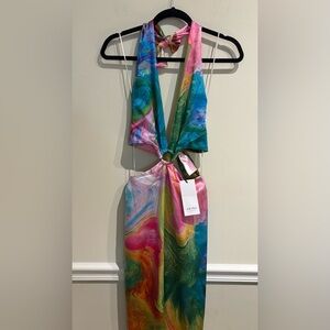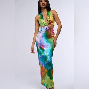 AKIRA Free Spirit Satin Maxi Dress Abstract Rainbow NWT Size Medium