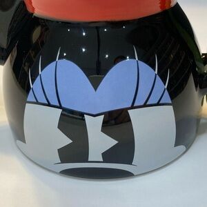 This stoneware mug features a vintage style Minnie Mouse wearing a red hat. The mug's handle has slots to fit the green flower spoon.