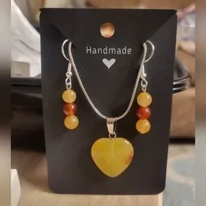 Handmade Yellow And Orange Heart Necklace & Earring Set. Earring hooks are Silver plated & hypoallergenic, necklace chain is 18in long. Will come in a yellow organza bag, Thank you for looking! :)