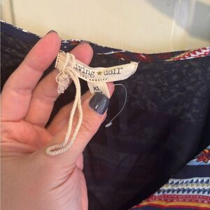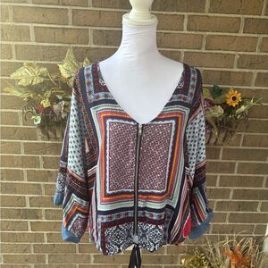 Chic blouse with a striking blue and red pattern. Features a front zipper and flowy sleeves. Ideal for casual outings.
