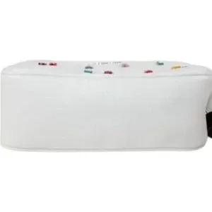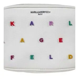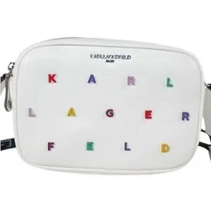 Turn heads with this authentic Karl Lagerfeld white crossbody bag, featuring a bold and playful colorful lettered print and the designer's signature wide guitar strap for a standout, street-chic edge. Crafted from high-quality materials, this structured bag combines fashion and function with a spacious main compartment, secure zip closure, and Karl’s unmistakable design DNA.