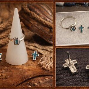 π΅β¨ VINTAGE 1980 Sterling Silver Turquoise Cross Set β Ring Sz 4 + Stud Earrings