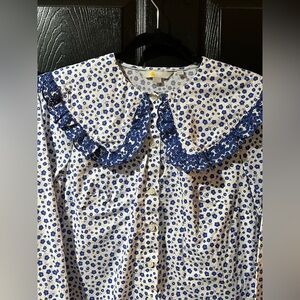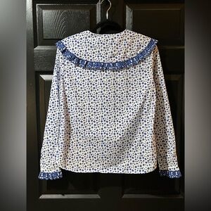 The ditsy-print shirt is no wallflower: the eye-catching oversized collar and ruffled embroidered edges are sure to make an entrance.