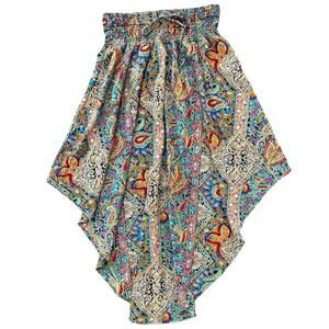 Handkerchief Hem Smocked High Waist Multicolor Paisley Maxi Skirt Size L Boho