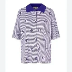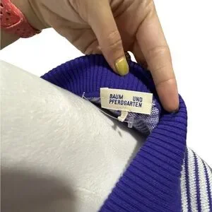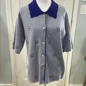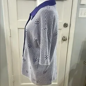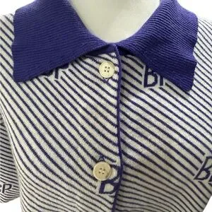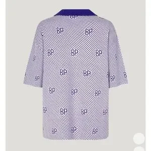 Stylish purple striped shirt with BP emblem pattern. Perfect danish design for casual wear. Pit to pit is about 20 inches. Length from neck to base is around 25 inches. Fabric is polyamide, cotton, viscose and cashmere, it’s a light to medium weight knit. This is an amazing brand, IYKYK…