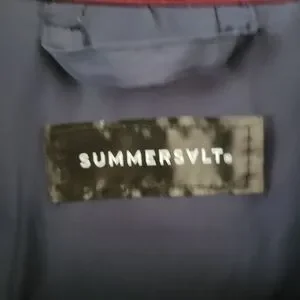The coat has a puffer jacket style with quilted accents.